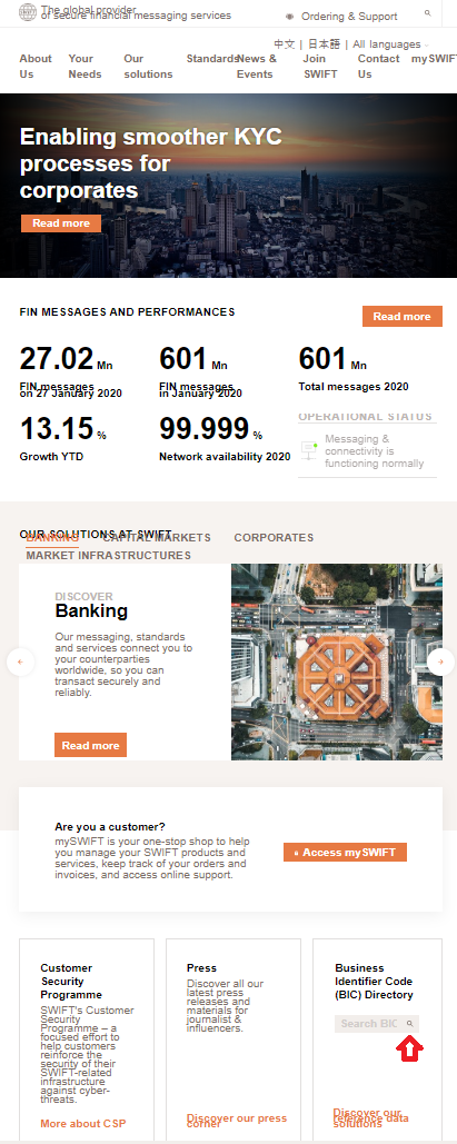 홈페이지 접속 후 하단으로 내리면 Business Identifier Code (BIC) Directory 라는 부분이 있습니다. BIC가 바로 스위프트코드로 이미 알고 계신 스위프트코드를 확인차 입력하시거나 은행의 영문명을 검색해보시면 SWIFT CODE를 확인하실 수 있습니다.