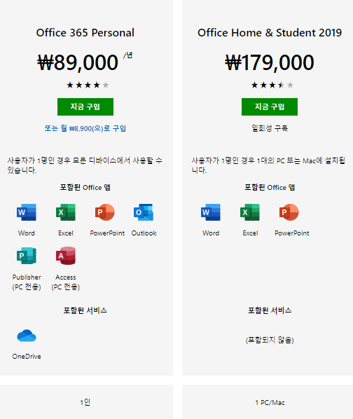 오피스365는 월 8,900원으로 구독하는 시스템으로 한끼 외식비 정도 가격으로 워드, 엑셀, 파워포인트 외에도 아웃룩, 퍼블리셔, 악세스까지 다른 전문적인 MS사의 프로그램도 이용할 수 있고, 가장 중요한 부분은 One Drive를 제공하는 점에 있습니다. 1인당 1TB의 클라우드 저장소를 별도로 제공한다는 점이 가장 큰 차이입니다.