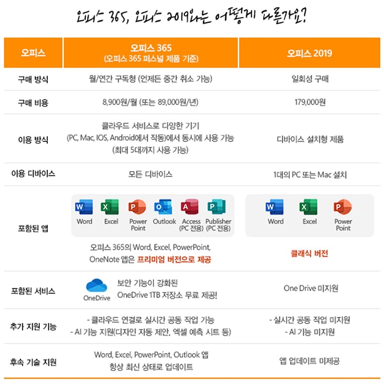 오피스365와 오피스2019 차이 비교, 장단점