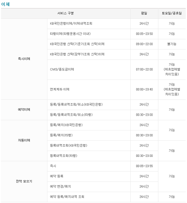 국민은행 자동이체 시간과 수수료, 점검시간