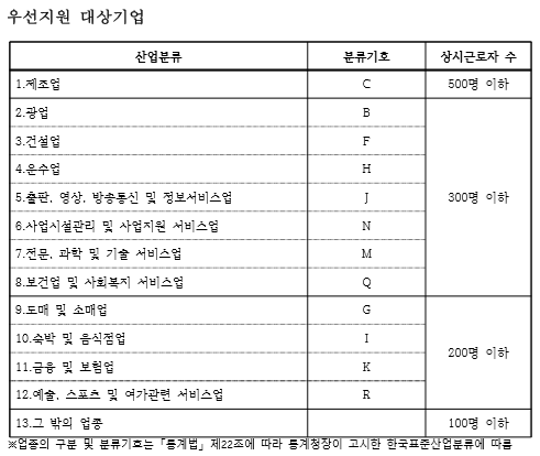 제조업의 경우 500명 이하, 건설 정보 통신업은 300명 이하, 도소매 숙박 음식 금융 보험은 200명 이하의 사업장이 대상으로 우선지원 대상기업의 경우 위와 같이 지원을 받을 수 있습니다.