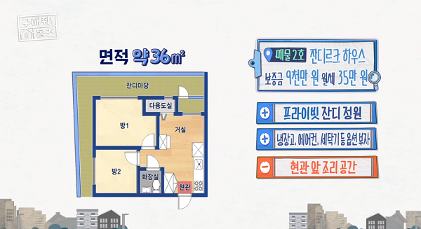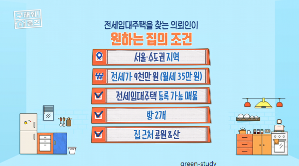 이번 구해줘 홈즈는 여자 혼자 자취하려는 분 중에서 전세임대주택이 가능한 집인 매물을 찾는 회차였습니다. 전세가 9천만원 (또는 월세 35만원)인 집이면서 전세임대주택 지원을 받아야하기 때문에 전세임대주택 등록 가능 매물인 집을 찾았었는데요.
