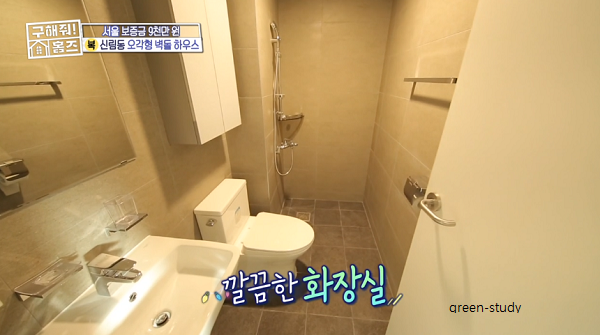 화장실도 깔끔하게 되어있는데요. 제가 볼 때 이 집의 아쉬운 점은 세탁실이 있기는 하지만 빨래 널기에는 조금 부족해보이는데요. 베란다가 없어서 빨래를 너는 공간이 애매할 수 있다는 점입니다. 집 안에서 널게 되면 공기가 눅눅해 질 수 있어보였습니다.