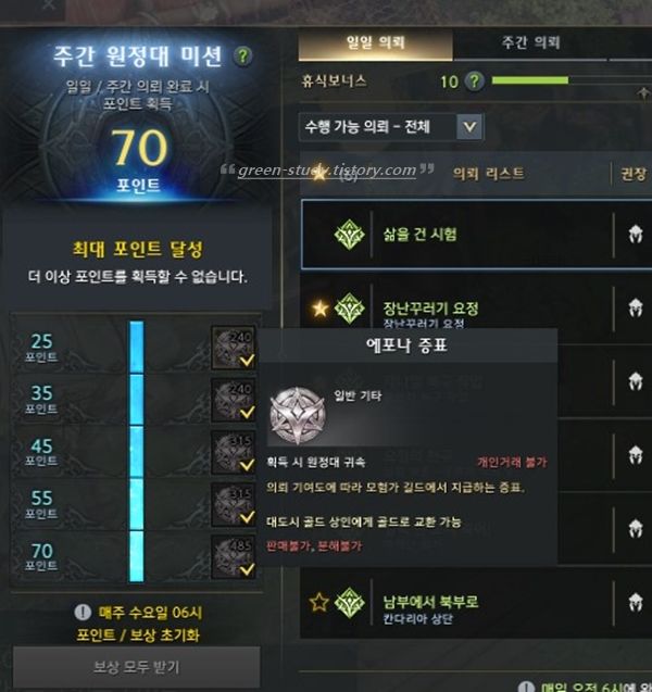 단축키 [Alt + J]로 에포나 의뢰를 수행할 때 포인트를 달성하면 얻을 수 있는 '주간 원정대 미션'이 있습니다. 일일 에포나 또는 주간 에포나를 완료할 때 포인트가 쌓이는데, 포인트 달성시 보상으로 받는 에포나의 증표를 각 마을의 '골드 상점' NPC와 교환하여 골드를 획득할 수 있습니다.