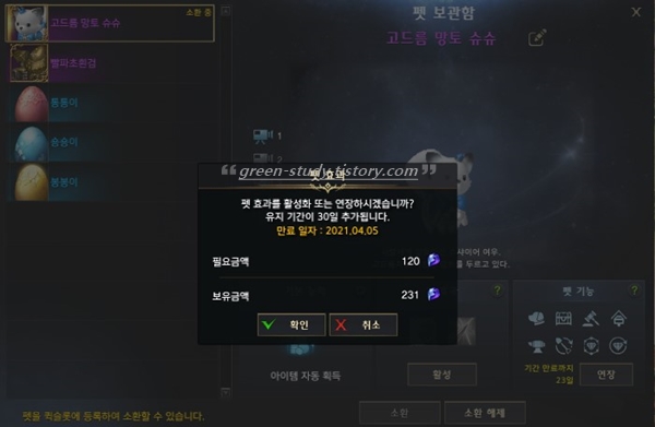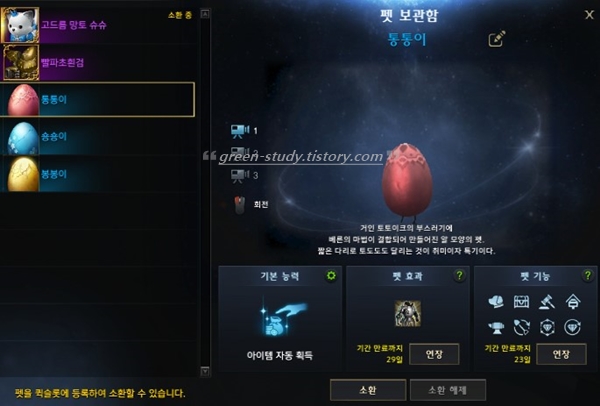 귀엽게 생겨서 인기가 있는 펫인데, 시즌이 지나면 다시 구입할 수 없기 때문에 이전에 출시된 펫을 구입하시려면 골드로 거래소에서 펫을 구입하는 방법이 있습니다.