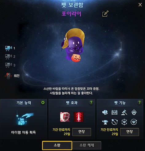 펫은 카오스던전을 비롯하여 가디언 토벌 등을 할 때 떨어지는 다양한 아이템을 자동으로 주워주는 기능이 있고 그 밖에도 편의 기능으로 펫 창고를 제공하여 창고 확장과 언제 어디서든 거래소를 사용하고 우편, 보석 효과 변환, 수리 등 편의 기능을 사용할 수 있어서 유용합니다.