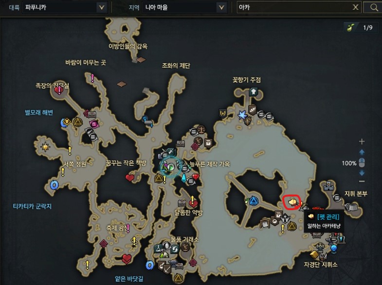 지도에서 [아카테냥]으로 검색하면 쉽게 찾아볼 수 있는데요. 강아지 모양의 아이콘으로 되어있습니다. 이 곳에서 크리스탈로 원하는 효과가 나올 때까지 펫 효과를 변경할 수 있습니다.