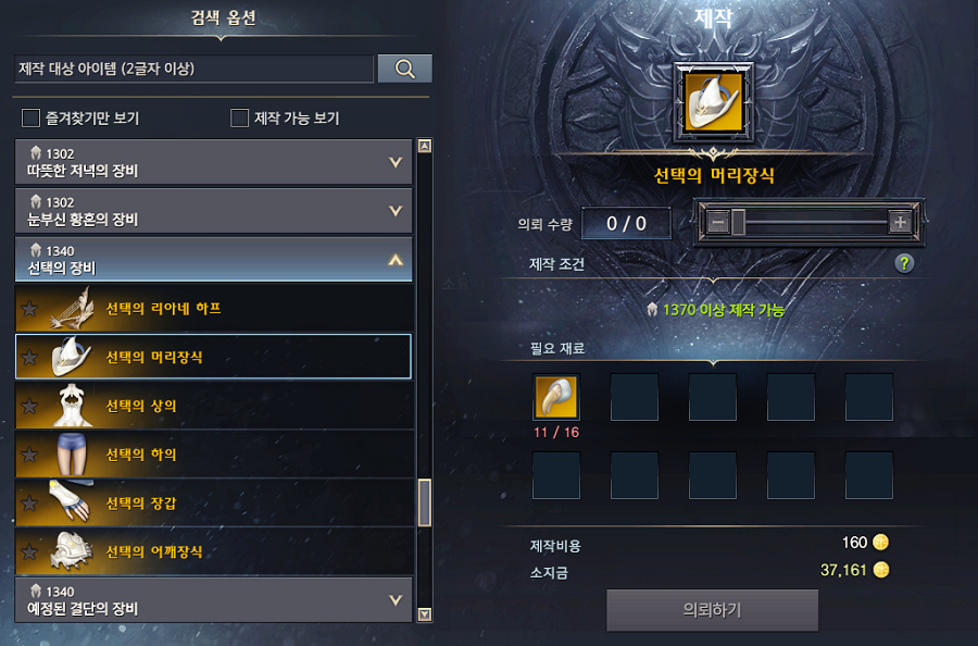선택, 예정, 냉혹 3종의 경우 아르고스를 토벌하여 나오는 재료로 장비를 만들 수 있습니다. 직접 만들려면 예정, 냉혹 장비는 1 피스 만드는데 3주가 걸립니다. 선택 장비도 만드는데 1주일에 1피스를 만들 수 있기 때문에 경매장에서 구입하는 것이 가장 빠른 길입니다.