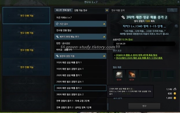 연구소 레벨이 2레벨 이상이어야 하기 때문에 꾸준히 원정대 영지도 키우는 것이 부캐 육성에도 도움이 됩니다.