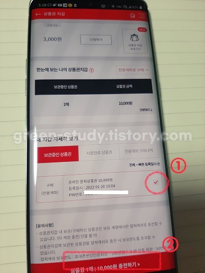 해당 상품권을 클릭하여 ①체크 표시를 하고, [②상품권 1매 충전하기]를 클릭합니다.