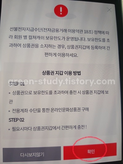 이렇게 복잡하게 변경된 이유를 찾아보니 선불 전자 지급 수단 정책에 따라 전자금융거래 이용약관 18조에 의거하여 문화상품권 전용 계좌로 상품권 충전, 구매시 바로 사용할 수 있는 돈으로 바뀌는 것이 아니라 온라인 상품권을 구입하여 '상품권 지갑'으로 들어가게 됩니다. 상품권 보유 한도를 초과하였을 경우라고 하는데, 1만원 정도의 금액임에도 온라인 문화 상품권 구입 방식으로 변경되었습니다.