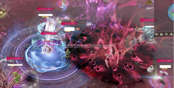 (만약, 딜이 충분하다면 이때 니나브를 사용하지 말고 촉수 패턴때 사용하면 됩니다. 6시에서 촉수가 우측 좌측으로 일직선 상에 위치하고 있기 때문에 6시에 있는 촉수에서 다음 촉수를 바라보고 니나브를 쏘면 3개가 동시에 제거 됩니다. 이 경우에는 마지막에 에스더 게이지가 늦게 찰 수가 있어서 10줄 남기고 웨이를 사용 할 수 있도록 에스더 게이지를 모아야 됩니다.)