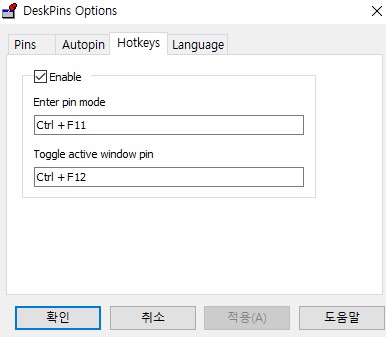 옵션도 설정할 수 있는데요. 단축키는 컨트롤(ctrl + F11)한 후 창을 클릭하여 핀을 고정할 수 있습니다. 단축키는 옵션에서 변경 가능합니다.
