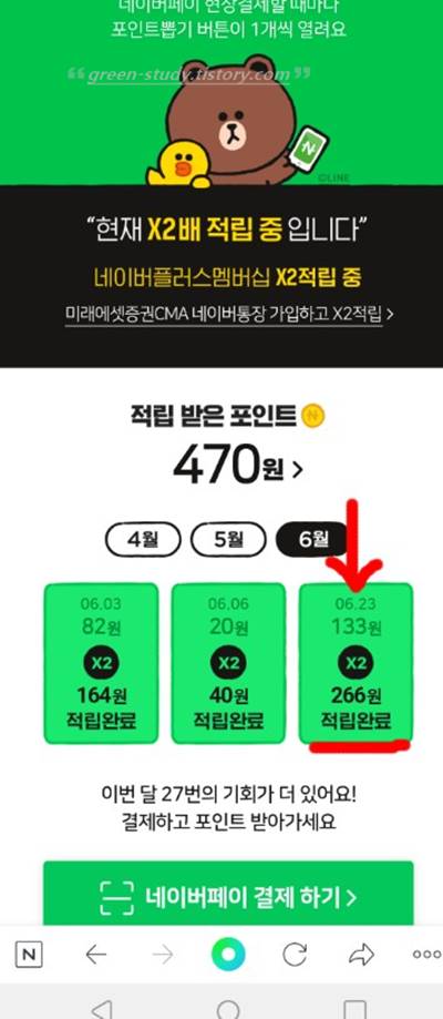 즉, 위에서 네이버플러스 멤버십이라 2배적립하여 266원 적립이 되었지만, 네이버통장 통장까지 혜택이 있었다면 결제금액의 3%인 532원이 적립되었을 것으로 예상됩니다.