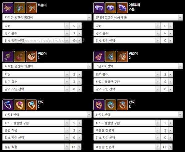 장신구 뿐 아니라 어빌리스톤에도 모두 해당하는 것입니다만, '공격력' 감소는 가장 좋지 않은 디버프입니다. 특히 공컷이 있던 시기에는 더더욱 그러하였는데요. 공격력과 딜의 영향력을 고려한다면 어떤 디버프든 중첩되지 않게 하는 것이 좋지만, 공격력 감소 디버프만은 만들지 않게 셋팅하는 것이 좋습니다.