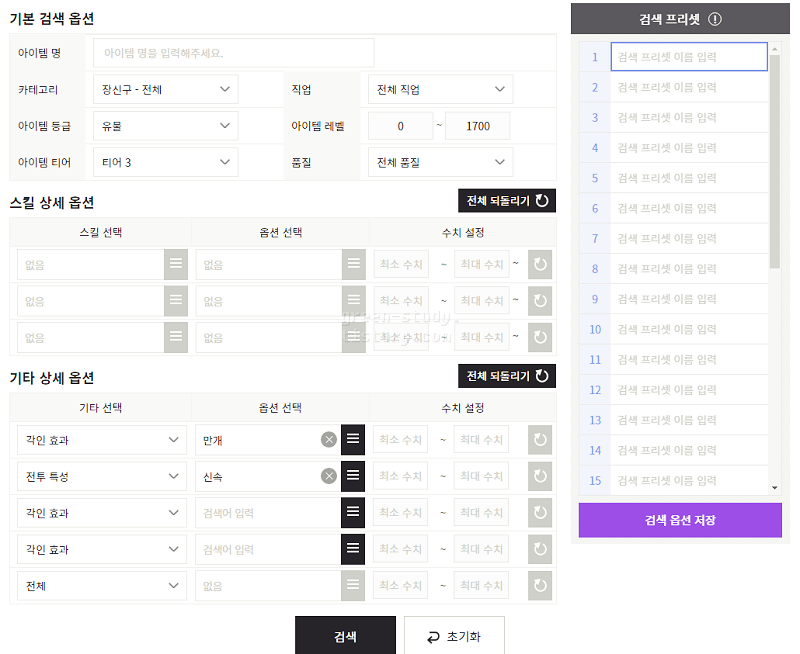 ▼ 상세 옵션에서 원하는 아이템 세부 정보를 입력하고 [검색]을 클릭하면 매물을 찾아볼 수 있습니다. 검색 프리셋에 저장하면 자주 찾는 옵션을 빠르게 찾는데 편리합니다.
