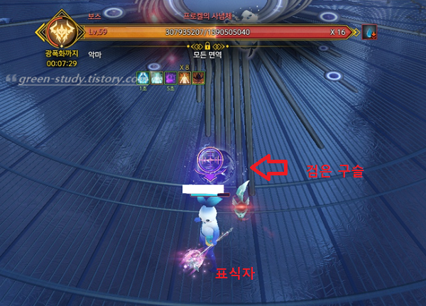 무력이후에 동서남북 방향에 각각 구슬이 생성 됩니다. 이 중에 검은색 구슬은 표식이 생긴 분이 검은 구슬 뒤에 위치해서 프로켈의 사념체의 공격을 검은색 구슬에 맞추는 방식으로 해결 해야 됩니다.
