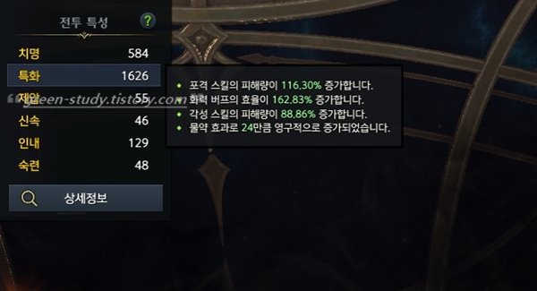 전투 특성은 올 특화에 목걸이 치명 특화 입니다. 여기서 팔찌와 카드작을 통해서 치명을 올려줍니다. (남바절은 필수입니다.) 만약, 팔찌와 카드작을 통해서 치명을 확보하기 어려운 상태라면 귀걸이나 반지 하나를 치명으로 바꿔서 치명 비율을 올려줍니다.