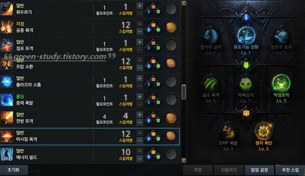 위에서 설명한 셋팅이 끝나셨다면, 이후에는 보석과 트라이포드작을 해줘야 됩니다. 특히, 트포작을 우선적으로 해주셔야 되는데요. 공중 포격의 전기 폭격 핵폭탄은 무조건 Lv5까지 만들어주시고, 미사일 포격의 약점 포탁, 원자 폭탄도 Lv5까지 만들어주셔야 됩니다. 일단, 이것이 기본입니다.