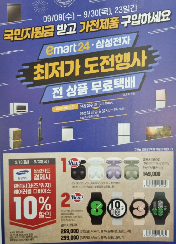 삼성카드로 재난지원금을 받으셨다면 삼성 제품 최대 할인 10%를 받을 수도 있습니다. 인터넷 가격이 더 저렴하게 판매 되는 중이지만 재난지원금을 특별히 사용하고 싶은 곳이 없다면 사용처로 고민해보실 수 있는 부분입니다. 편의점에서 카탈로그를 통해 에어프라이기, 전자랜지, 청소기, 애플 제품 등도 판매를 한다고 하니, 인근 편의점의 카탈로그를 확인해보시면 재난지원금 사용처를 확장할 수 있을 것 같네요.