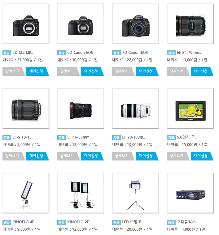 처음 입문할 때 아무 것도 모른 상태로 장비를 구입하게 되면 불필요한 장비 또는 원하는 성능이 아닌 장비를 구입하게 될 수도 있고, 비용적인 부분에 있어서도 부담이 되기 때문에 잘 사용하지 않는 장비는 대여하는 것이 유리합니다. 장비 대여 비용은 시청자미디어 재단 센터마다 다르고, 대여해주는 장비 종류도 차이가 있습니다.