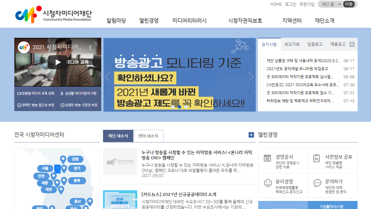 시청자미디어 재단은 방송 촬영 관련 교육 정보도 제공하고, 소외계층 미디어 접근 보장과 방송제작에 필요한 장비를 지원하는 곳입니다.