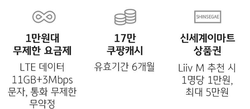 유효기간 6개월인 17만 쿠팡 캐시, 1만원대 무제한 데이터 요금제, 신세계 이마트 상품권 추천시 1명당 1만원 최대 5만원까지 할인을 제공하고 있습니다.