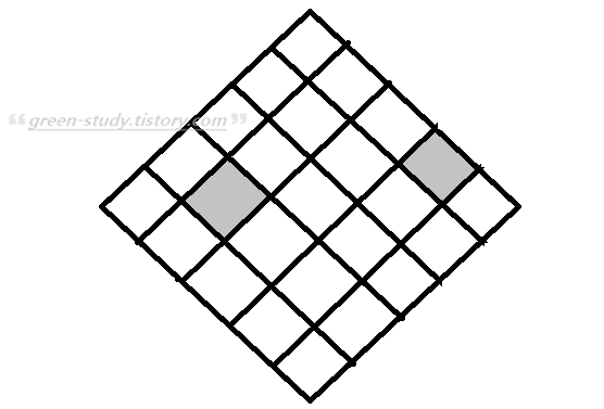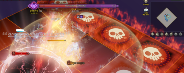 총 5곱하기 5 구조로 되어 있는 마름모 스테이지에서 전투가 시작 됩니다. 진입하시게 되면, 랜덤하게 두 군데가 해골 장판 일텐데요. 가장 먼저 지워야 됩니다.