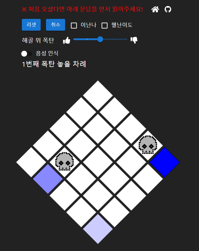 마찬가지 방법으로 두번쨰 폭탄도 반대 방향에 놓으시면 기존에 있던 해골 문양은 모두 사라지게 됩니다. 여기까지가 처음 시작 하실때 하셔야 하는 기본 공략 입니다. 방향은 중요하지 않고 해골 장판을 삭제 할 수 있는 자리에만 놓으시면 됩니다.