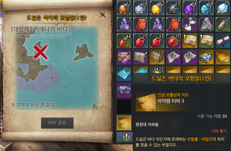 얻게 된 항해 모험물은 원정대 창고 공유가 되기 때문에 부캐 중에서 전용 캐릭터가 있다면 몰아주는 것도 가능합니다. 인벤토리에 처리가 어려우시다면 원정대 창고에 옮긴 뒤 부캐릭터 창고로 옮기시면 됩니다. 가방(i)에서 획득한 모험물을 마우스 우클릭을 하면 위치 지도가 나옵니다. 지도를 보면 항해 모험물 위치를 알 수 있습니다.