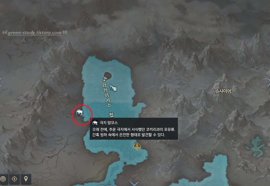 모험의 서 슈사이어 보상으로 획득한 모험물: 극지 맘모스 위치는 슈사이어 라카이서스 협만에 위치합니다.