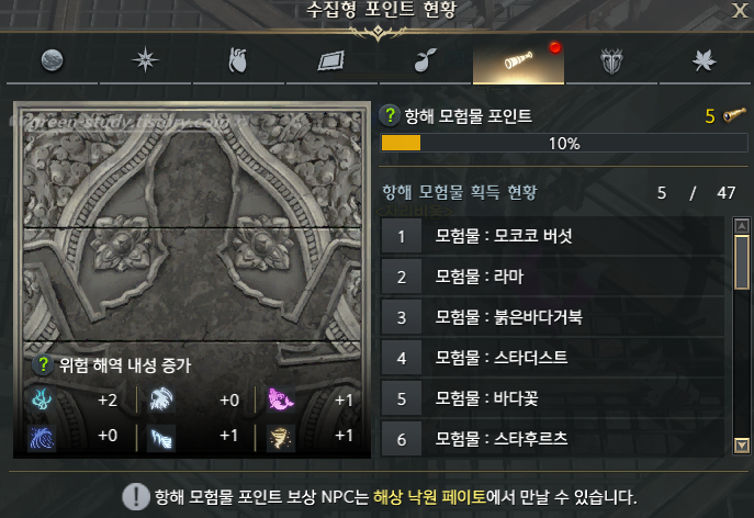 수집형 포인트 확인은 단축키 [Alt + L]로 확인할 수 있습니다. 로아 항해 모험물 포인트 보상 NPC는 해상 낙원 페이토에 위치합니다.