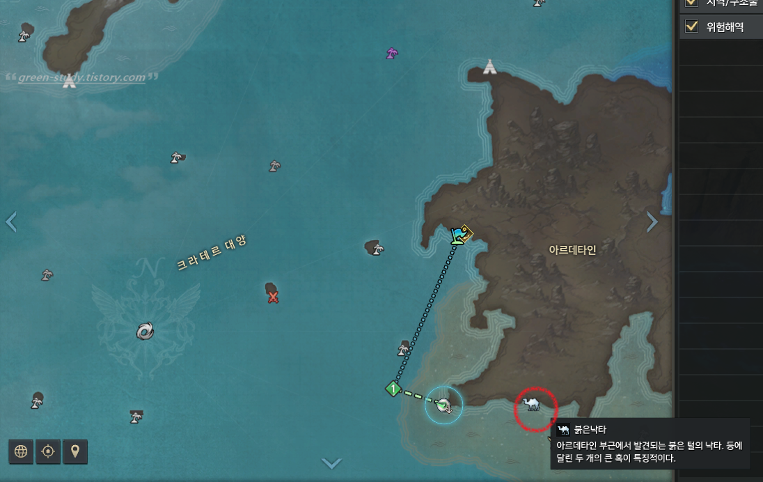 아르테타인 모험의 서 보상으로 획득한 모험물: 붉은 낙타의 위치는 아르테타인 대륙 남쪽에 위치한 모래 폭풍 지역에 있습니다.