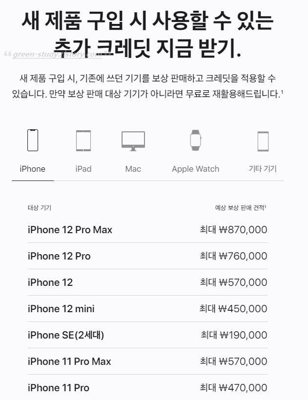 Apple 공식 홈페이지에서 크레딧으로 교환을 해주는데요. 최신 출시되고 사전 예약 중인 아이폰13의 경우 1년 전에 판매한 12를 위와 같이 크레딧으로 교환해줍니다. 11버전도 있기 때문에 아이폰12를 추후에 아이폰14 버전이 나올 때 보상판매가 가능할 것으로 예상 됩니다.