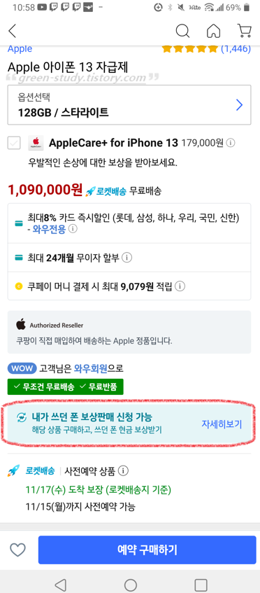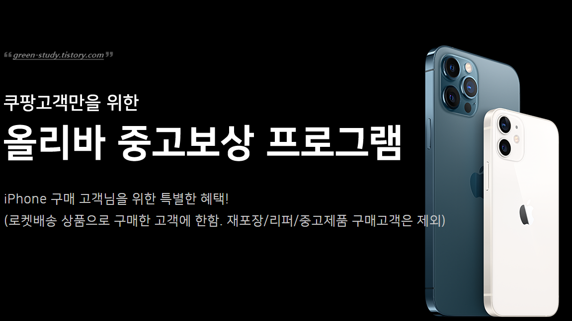위와 같이 모바일 버전 쿠팡에서 아이폰13 사전예약 페이지를 확인해보면, 보상판매 신청하는 페이지가 있습니다. 쿠팡에서 '로켓 배송'으로 구입한 상품이 중고가 되었을 때, 휴대폰을 반납하고 현금으로 보상받는 프로그램입니다. 쿠팡에서 직접 매입하는 것이 아니라 올리바라는 곳에서 주관합니다.