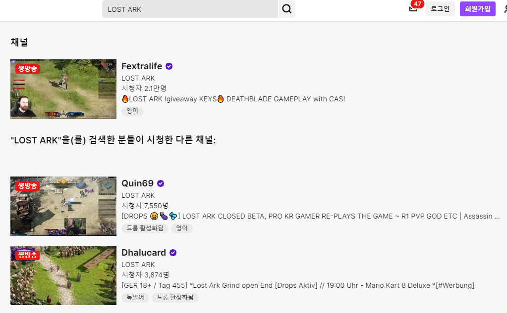 로스트아크 CBT 북미를 비롯하여 유럽, 호주, 남미 등 글로벌 서비스를 시작하였습니다. 7일간 테스트 기간이 진행되는데요. 한국에서는 이미 성공한 게임이 되었지만, 해외에서는 어떤 반응일지 궁금하여 트위치에서 lost ark로 검색하여 해외 게임 유튜버의 반응을 살펴보았습니다. 시간을 많이 들여서 살펴본 것은 아니고 분위기 정도만 관찰하였습니다. 피크 시간대에 25만명까지 시청자가 있었다고 하니 CBT 서비스임에도 관심도가 있다고 볼 수 있습니다.