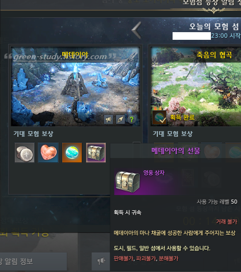 모험의 섬이라고 하여 하루 1번 보상을 받을 수 있는 섬 목록 중 메데이아가 랜덤으로 나옵니다. 모험의 섬은 1일 1회 클리어(주말은 2회) 가능한 랜덤 섬으로 메데이아는 보정 PVP 섬인데요. 아이템 보정이 되지 않는 슬라임 섬과 다르게 템 레벨과 특성이 보정되며 각인만 적용이 됩니다.