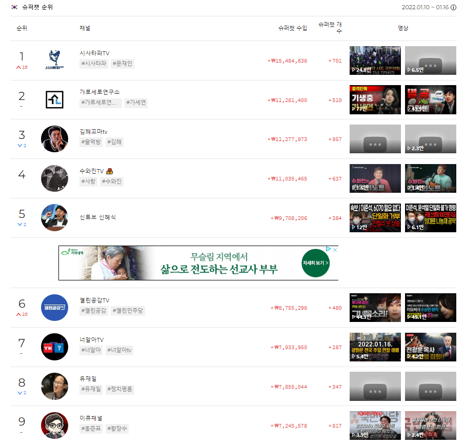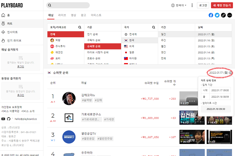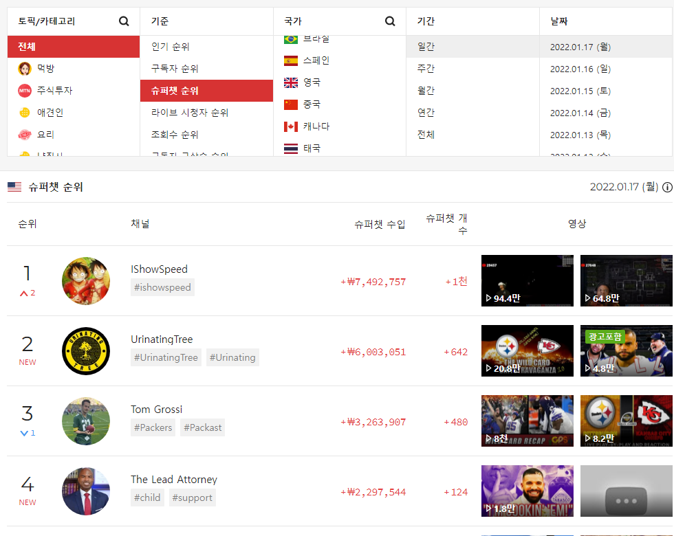전체 슈퍼챗 순위에서 '한국'으로 '일간' 검색하였을 때 결과입니다.