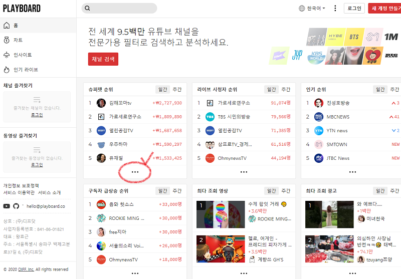 플레이보드(Playboard)라는 사이트에서 유튜브 채널 순위를 분석할 수 있습니다.