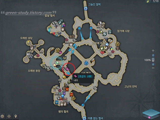 각 마을의 대도시에서 [호감도 교환] npc를 검색해보면 위치를 바로 확인할 수 있습니다. 보통 분홍색으로 눈에 띄는 npc로 되어있습니다.