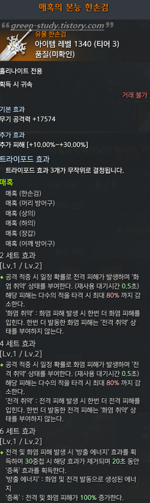 쿠크 나팔을 이용해서 Lv.2로 올렸다고 전제한다면, 환각 풀세트는 적에게 주는 피해 29% 증가, 치명타 적중률 25% 증가 입니다.