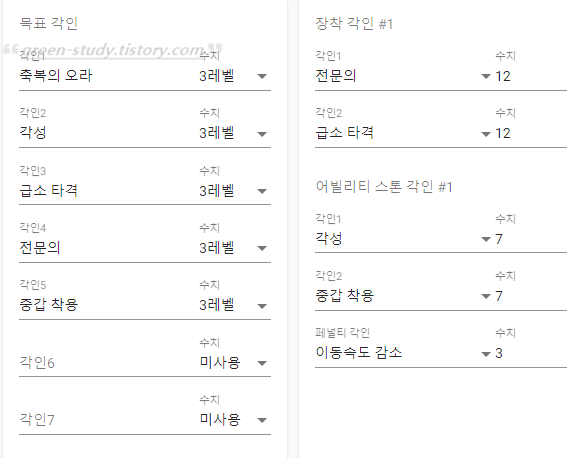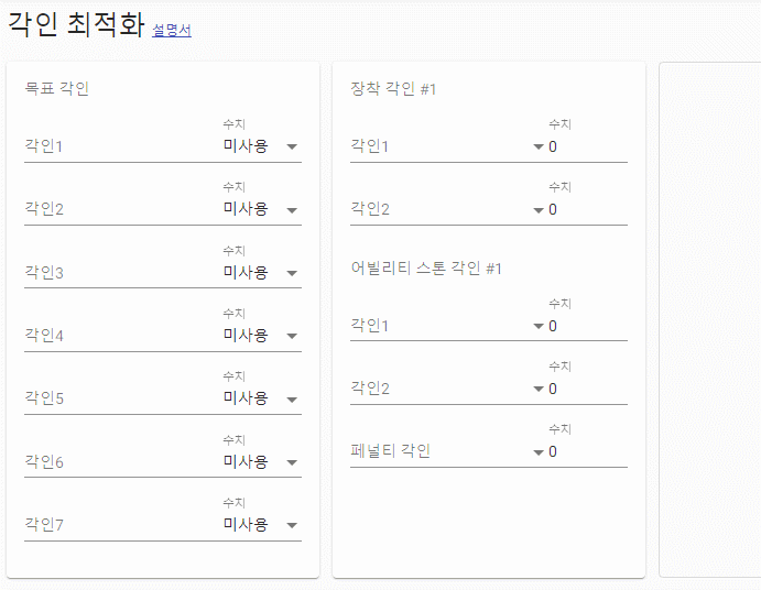대략적으로 위와 같이 원하는 각인 세팅과 장착 세팅을 입력한다고 가정합니다.