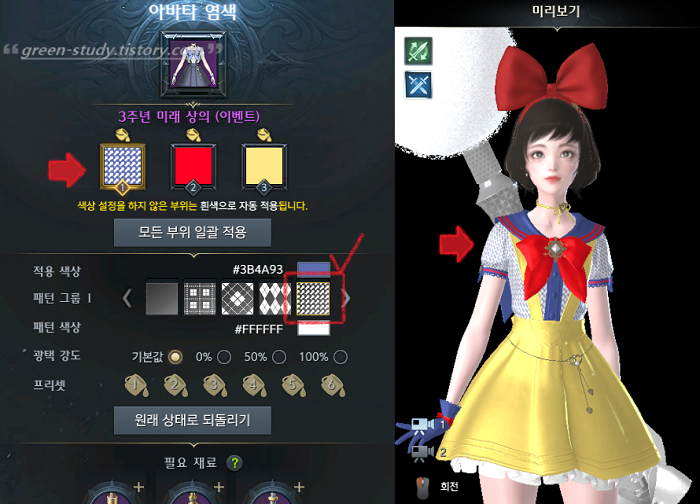 3주년 미래 상의 아바타에 백설공주 옷 색상 코드를 입력하였습니다.