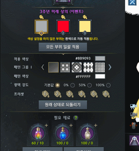염색이 되는 아바타의 경우 "마법학회 염색 시약" "패턴 시약" "광택 시약"으로 염색을 진행할 수 있습니다.