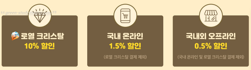| 로아 전용 혜택 | 🎮 로스트아크 홈페이지, 인게임 샵의 로열 크리스탈 충전시 10% 청구 할인 (→최대 2만 5천원) (※ 전월 실적 조건 하단 참고) |