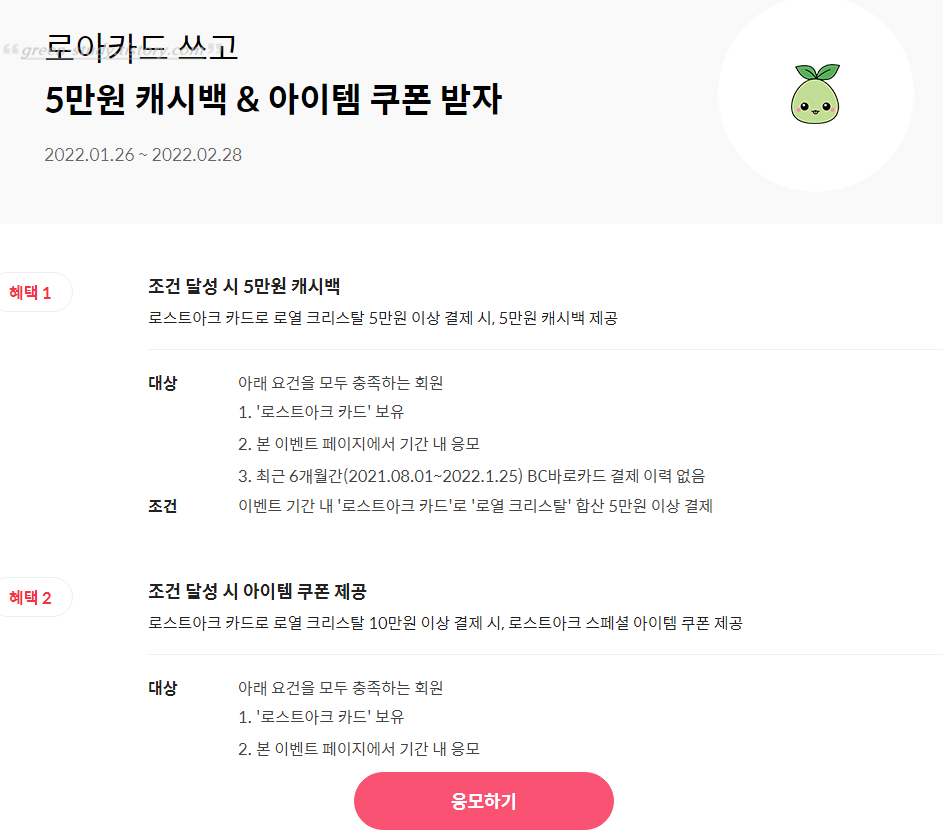| 대상 | 다음을 모두 만족하는 회원 ① 로스트아크 카드 보유 ② 페이북 이벤트 페이지에서 기간 내 응모 [바로가기] ③ 최근 6개월 간(2021. 8. 1부터 2022. 1. 25까지) BC 바로 카드 결제 이력 없음 |