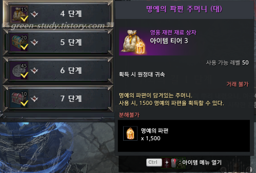 - 1355레벨: 권좌의 길 4단계 시도 (명예의 파편 주머니(대) 15)