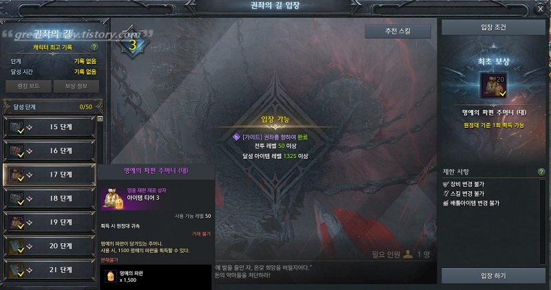 딜러 기준으로 1415레벨에 도달 하신 이후에 유물 장신구로 각인 셋팅을 4줄 이상 하셨다면, 권좌의 길 17단계에서 명예의 파편 주머니(대) 20개와 19단계에서 명예의 파편 주머니(대) 25개도 획득이 가능해집니다. (권좌의 길에서 획득 할 수가 있는 전설 각인서는 비싼 것으로 교체해서 판매 하는 것을 권합니다.)