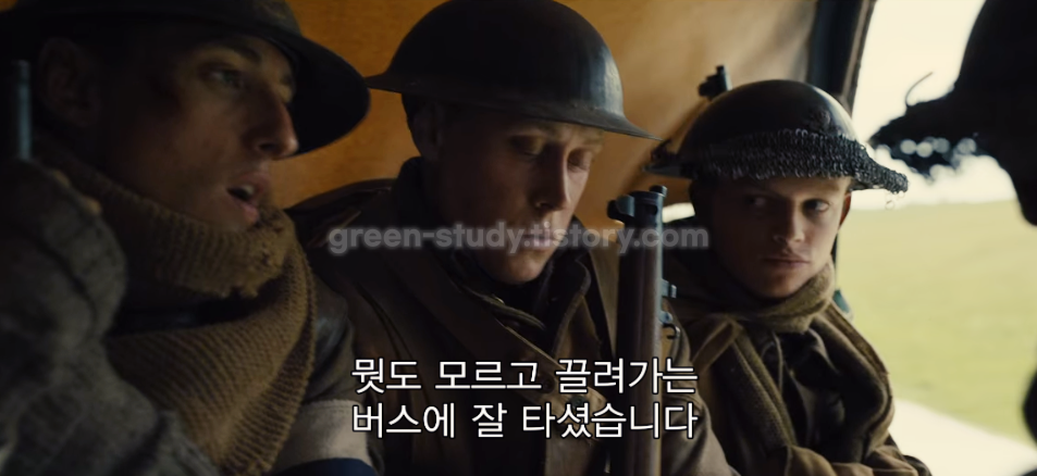 이렇게 정신적으로 온건해보이는 방법을 사용하기도 하지만, 물러나면 총살 하겠다는 공포를 주기도 합니다. 중간에 만난 영국군은 트럭에 타면서 어디로 끌려가는지 알 수가 없다는 말을 합니다. 전쟁에 참전한 병사들 또한, 지금 여기가 어디고 어떤 이유로 왜 싸우고 있는 지를 알지 못한다는 점을 묘사한 것입니다.