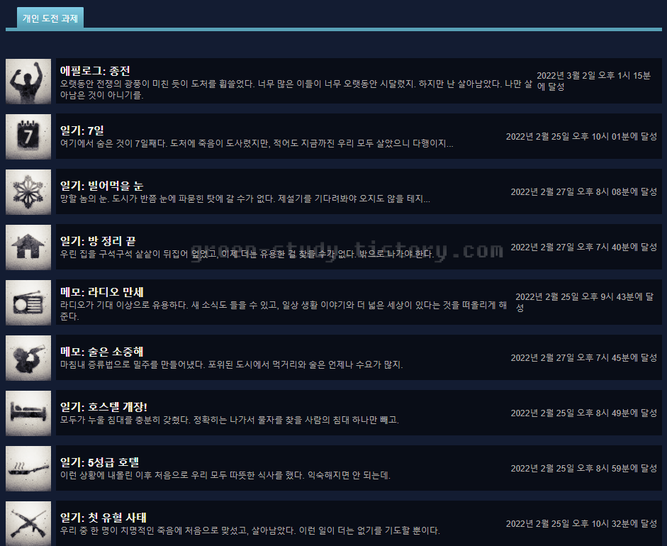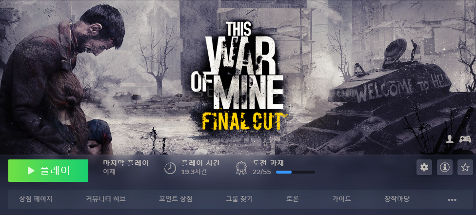 전쟁이 주는 참혹한 상황에 대한 묘사는 몰입감이 있기 때문에 게임 자체는 한번쯤 플레이 해볼만하기는 하지만, 전략 생존 게임 매니아에게는 아쉬움이 남는 게임 인 것 같습니다. 스토리 게임이라고 생각하시고 플레이를 하시는 것이 좋을 것 같은 게임이었습니다. 더 롱다크 같은 류의 생존 자체를 목적으로 하는 난이도가 높은 게임은 아닌 것 같습니다.